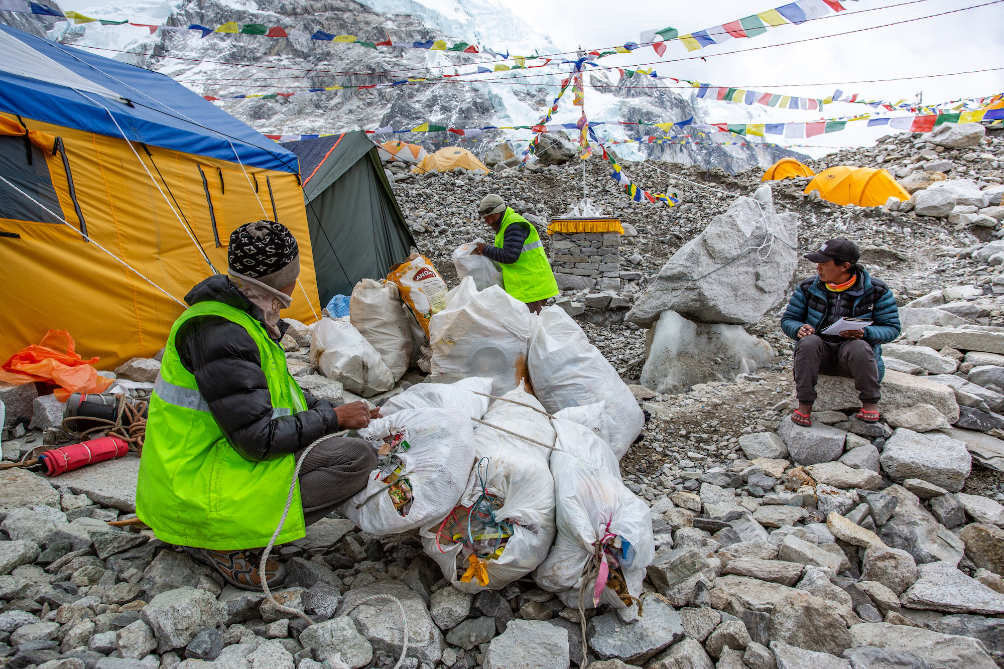Każda agencja, która zjawia się ze wspinaczami pod Everestem płaci kaucję. Jedną kaucję na każde pozwolenie wspinaczkowe oddzielnie za Everest, oddzielnie za Lhotse, oddzielnie za Nuptse (niezależnie od liczby wspinaczy). Wynosi ona cztery tysiące dolarów i jest gwarancją czystości na górze. Każda osoba schodząca do bazy po zakończeniu wspinaczki, tak samo Szerpa, jak i wspinacz, musi znieść ze sobą osiem kilogramów śmieci. Jeśli tego nie zrobi, kaucja przepada, dlatego lepiej jest się pilnować. Oczywiście żaden zachodni wspinacz nie ma ochoty dźwigać tylu kilogramów, zwłaszcza jeśli za wyprawę słono zapłacił. Taki wspinacz raczej w ogóle nic nie chce dźwigać, płaci za to, żeby było mu jak najlżej, jak najwygodniej. To z kolei prowadzi do tego, że to właśnie Szerpowie znoszą śmieci, znacznie więcej niż osiem kilogramów, znacznie częściej niż tylko jeden raz po nie idą.